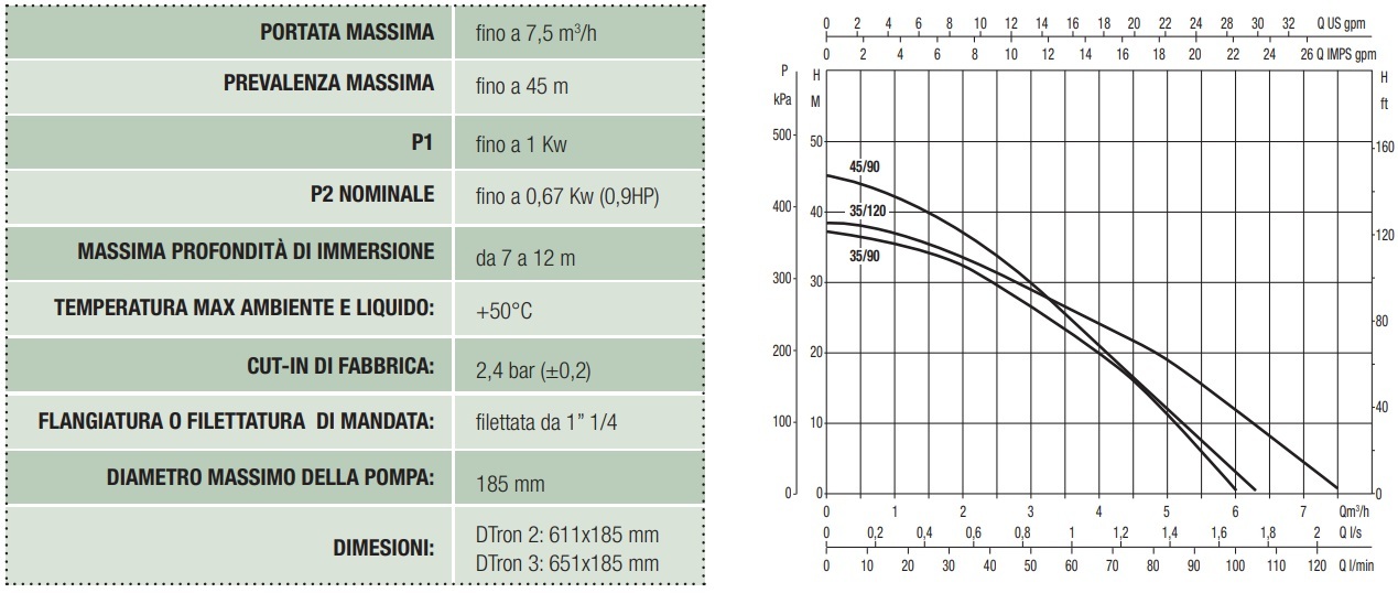 Pompa multigirante elettronica sommersa Dab Dtron 2 35/90 hp 0,7 (0,52 kw) da 7 pollici per acqua pulita progettata per l'impiego in pozzetti, cisterne o vasche. Adatta per l'utilizzo in ambiti domestici e residenziali per pressurizzazione, riutilizzo dell'acqua piovana, giardinaggio e irrigazione. Iva inclusa.