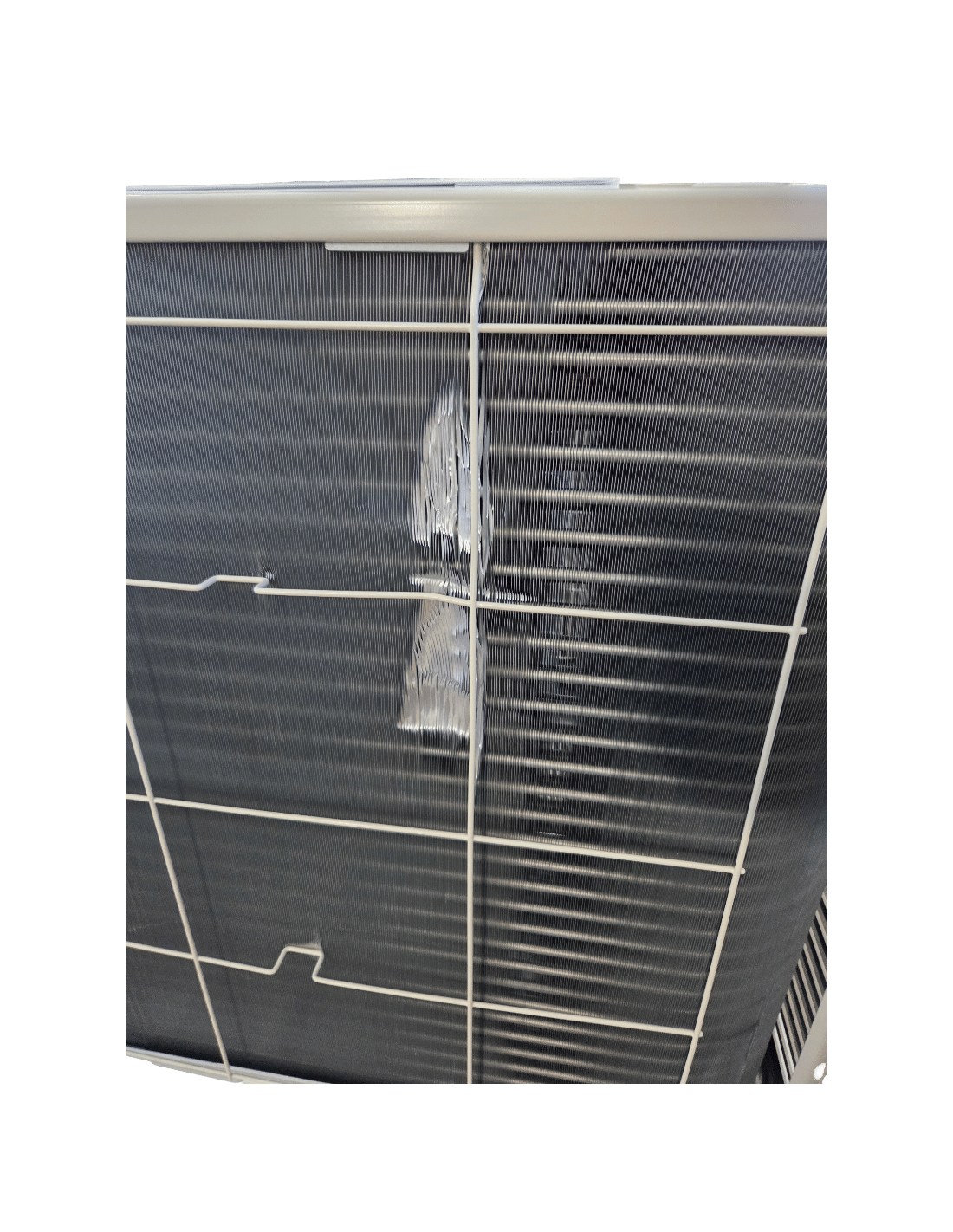 L'UNITA' ESTERNA HA LE LAMELLE POSTERIORI DANNEGGIATE E L'IMBALLO E' DANNEGGIATO.