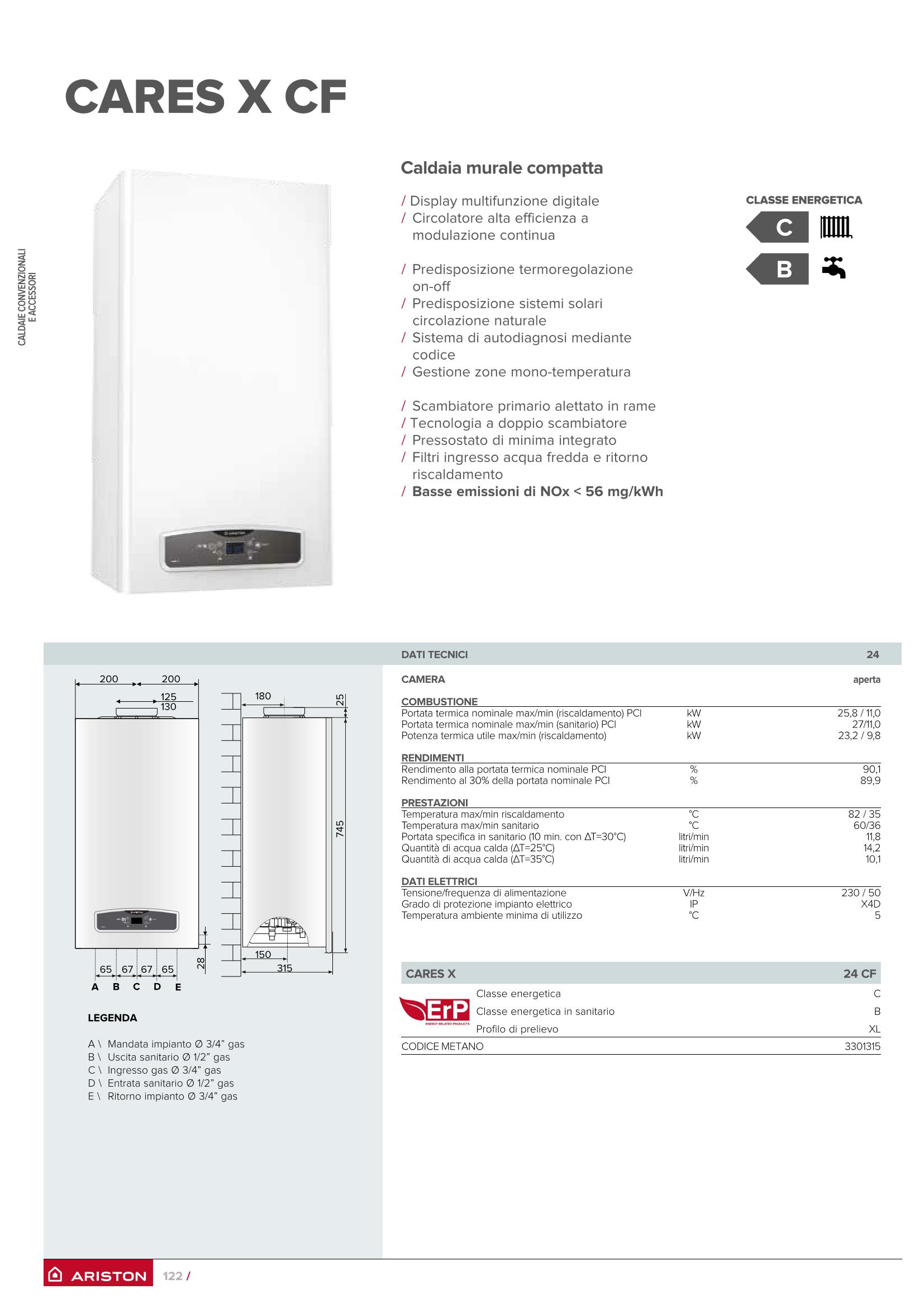 Caldaia Ariston murale a camera aperta serie Cares X 24 CF a gas metano portata 24 kw Low Nox (Basse emissioni di NOx < 56 mg/kWh). Classe efficienza Riscaldamento C, Classe efficienza Acqua calda sanitaria B. Spedizione su pedana iva e trasporto inclusi.