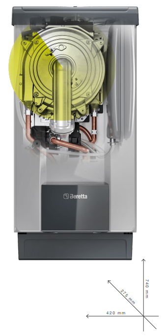 L’acciaio INOX, oltre all’alta resistenza all’azione corrosiva della condensa acida, previene la formazione interna di ossidi e di altri fenomeni elettrochimici tipici in installazioni su vecchi impianti. La geometria a spira unica avvolta (circuito idraulico in serie) assicura una portata costante in tutte le sezioni dello scambiatore e previene intrinsecamente fenomeni di intasamento. L’accesso frontale agevola le operazioni periodiche di manutenzione e pulizia della camera di combustione.