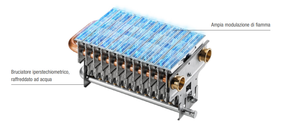Da questa caratteristica, in combinazione col raffreddamento del bruciatore attraverso l’acqua del circuito di riscaldamento, deriva un abbassamento sensibile dei valori inquinanti di ossido di carbonio e di azoto prodotti dalla combustione, tali da soddisfare a pieni voti i nuovi limiti imposti dalla normativa internazionale.