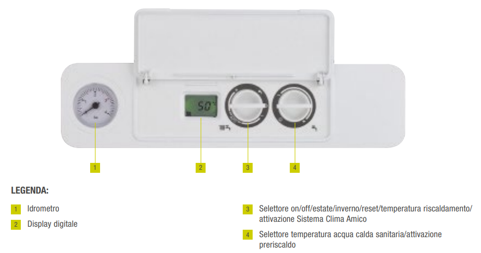 Il pannello comandi è coperto da uno sportellino, dal design lineare, sotto il quale si trovano un display digitale, che rende fruibili in maniera chiara tutte le informazioni sullo stato dell’apparecchio, e due manopole, attraverso cui l’utente finale può accedere facilmente e intuitivamente a tutte le funzioni necessarie per l’utilizzo della caldaia.