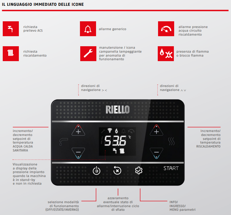La nuova interfaccia touch, uno degli elementi distintivi di START, conserva la semplicità di utilizzo che da sempre caratterizza i prodotti Riello