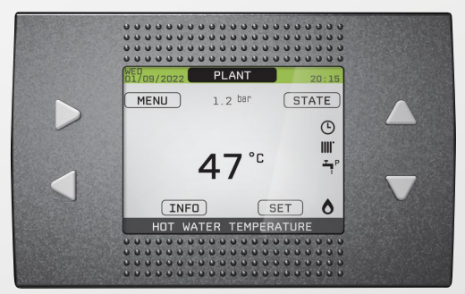 Oltre a data e ora, sul display vengono visualizzate le informazioni fondamentali relative al funzionamento della caldaia: la temperatura di mandata dell’acqua e la pressione dell’impianto. Tramite un’icona sul display, la caldaia avvisa anche della necessità di effettuare la manutenzione programmata.