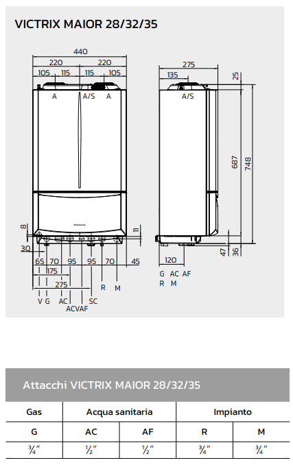 Gli attacchi idraulici sono gli stessi dei precedenti modelli e il gruppo di allacciamento è di serie per favorire gli installatori nelle sostituzioni. Tutte le VICTRIX MAIOR sono complete di filtro ciclonico magnetico