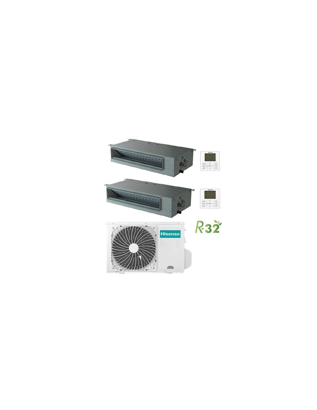 Climatizzatore Condizionatore Canalizzato Dual Split R32 Hisense 9000 + 18000 BTU pompa di calore inverter completo di una unità interna ADT26UX4RBL8, una unità interna ADT52UX4RCL8 e una unità esterna 3AMW72U4RJC e comando a filo. Classe A++/A+ Gas R32. Spedizione su pedana Iva e trasporto inclusi. Canalizzabile R32