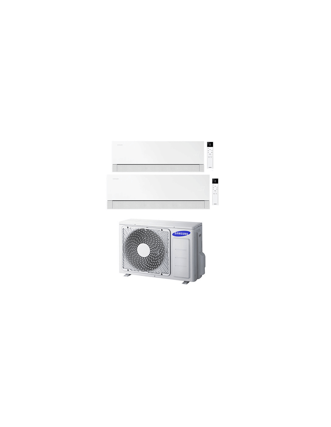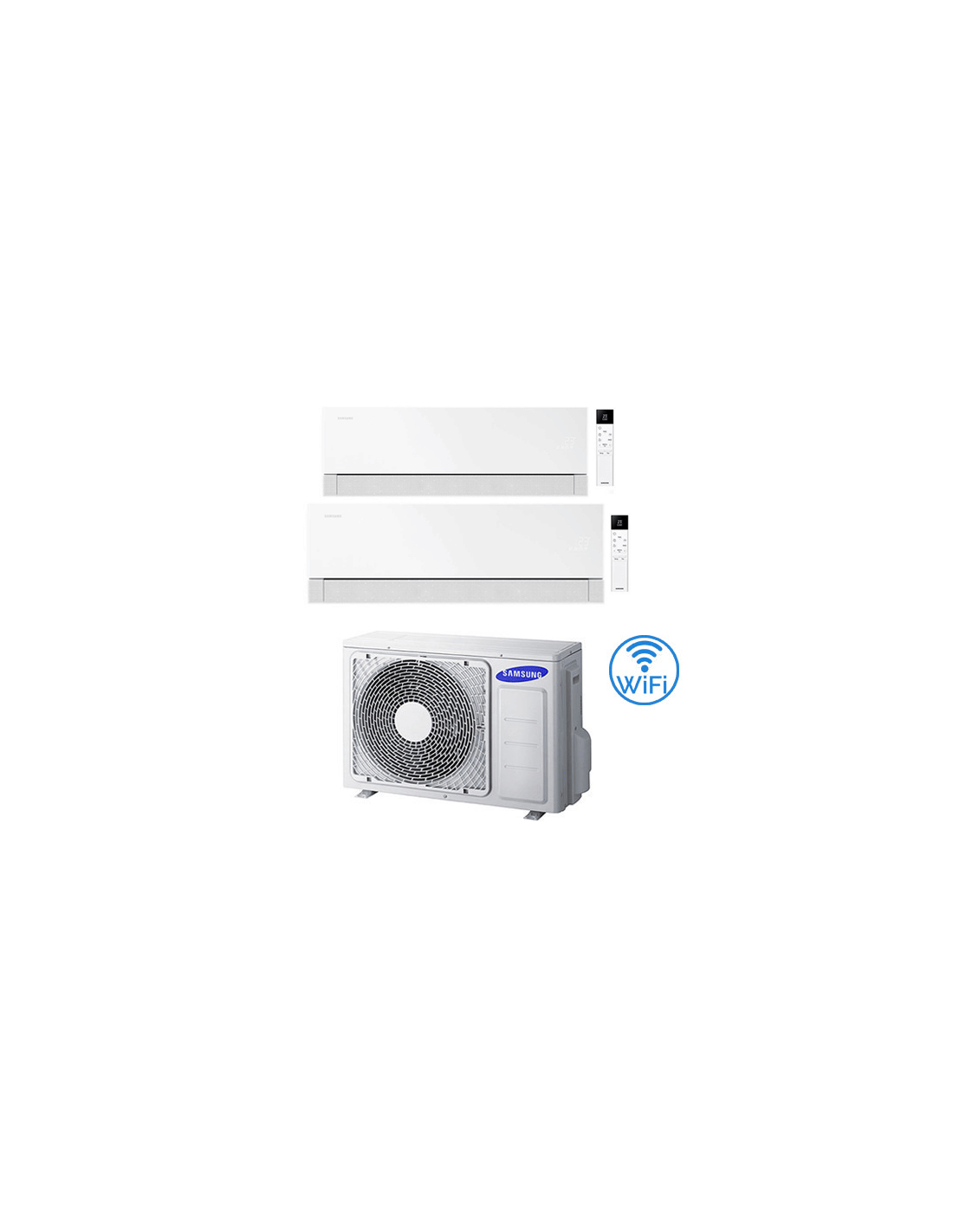 Climatizzatore Condizionatore Samsung Windfree Première Essential White Wifi Dual Split R32 Inverter 9 + 18 BTU composto da una unità esterna AJ050TXJ2KG/EU, una unità interna da 9000 BTU AR70H09C1AWNEU e una unità interna da 18000 BTU AR70H18C1AWNEU Classe A+++/A++ Gas R32. Spedizione su pedana Iva e trasporto inclusi.