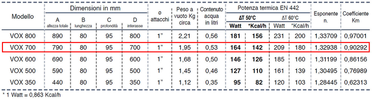 Potenza termica En 442: ΔT50°C 1640W 1420Kcal/h - ΔT60°C 2090W 1800Kcal/h