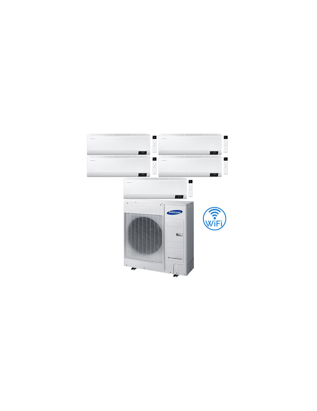Novitá Climatizzatore Condizionatore Samsung Windfree Elite R32 Wifi penta Split Inverter 7 + 9 + 12 + 12 + 12 BTU composto da una unità esterna AJ100TXJ5KG/EU, una unità interna da 7000 BTU AR07TXCAAWKNEU una unità interna da 9000 BTU AR09TXCAAWKNEU e tre unità da 12000 BTU AR12TXCAAWKNEU Classe A++/A+ Gas R32. Spedizione su pedana Iva e trasporto inclusi.