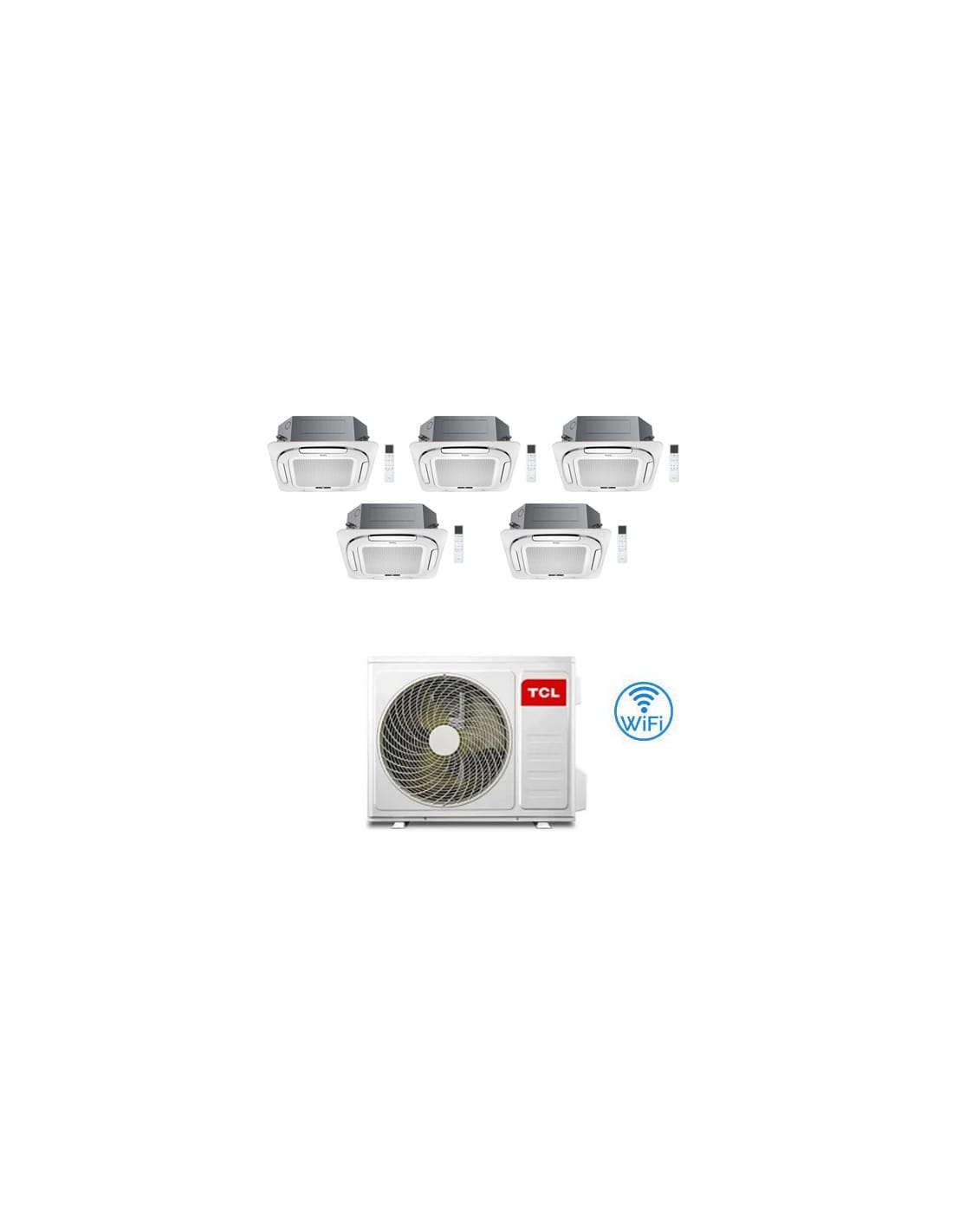 Climatizzatore Condizionatore TCL Cassetta 4 Vie Compact Wi-Fi R32 Penta Split Inverter 9 + 9 + 12 + 12 + 12 BTU composto da una unità esterna MT4250, due unità interne da 9000 BTU MN09SS2 e tre unità interne da 12000 BTU MN12SS1 con telecomando e griglia Classe A++/A+ Gas R32. Spedizione su pedana iva e trasporto inclusi. Cassetta 4 Vie Compact TCL