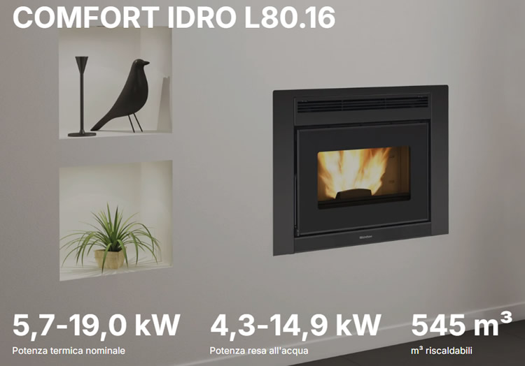 Termocamino a Pellet Idro Comfort Idro L80.16 – Calore efficiente e integrato per la tua casa- Il Comfort Idro L80.16 è un inserto idro a pellet ventilato di alta qualità progettato per offrire comfort, efficienza e prestazioni elevate integrandosi perfettamente con l’impianto di riscaldamento domestico.
