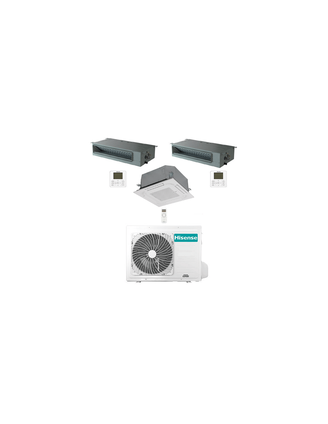 Climatizzatore Condizionatore Canalizzato + Cassetta Trial Split R32 Hisense 9000 + 9000 + 9000 BTU pompa di calore inverter completo di due unità interne ADT26UX4RBL8, una unità interna unità esterna 3AMW72U4RJC e comando a filo. Classe A++/A+ Gas R32. Spedizione su pedana Iva e trasporto inclusi. Canalizzabile R32