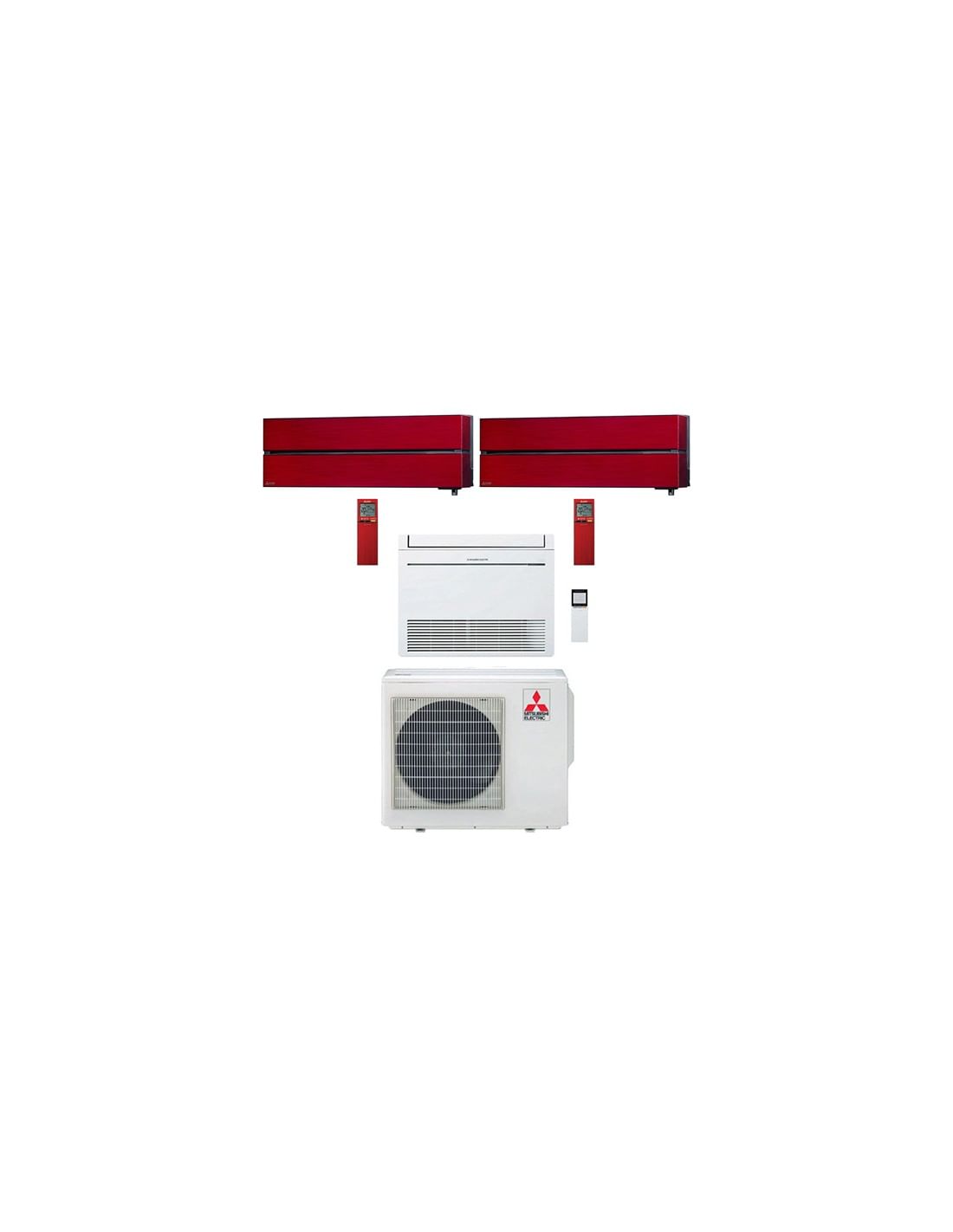 Novitá Climatizzatore Condizionatore Mitsubishi Kirigamine Style Rosso MSZ-LN + Pavimento Serie M MFZ-KT Trial Split Inverter 9000 + 12000 + 18000 BTU composto da una unità esterna MXZ-3F68VF, una unità interna da 9000 BTU MSZ-LN25VG2R, una unità interna Console da 12000 BTU MFZ-KT35VG ed una unità interna da 18000 BTU MSZ-LN50VG2R. Classe A++/A+ Gas R32. Spedizione su pedana Iva e trasporto inclusi.