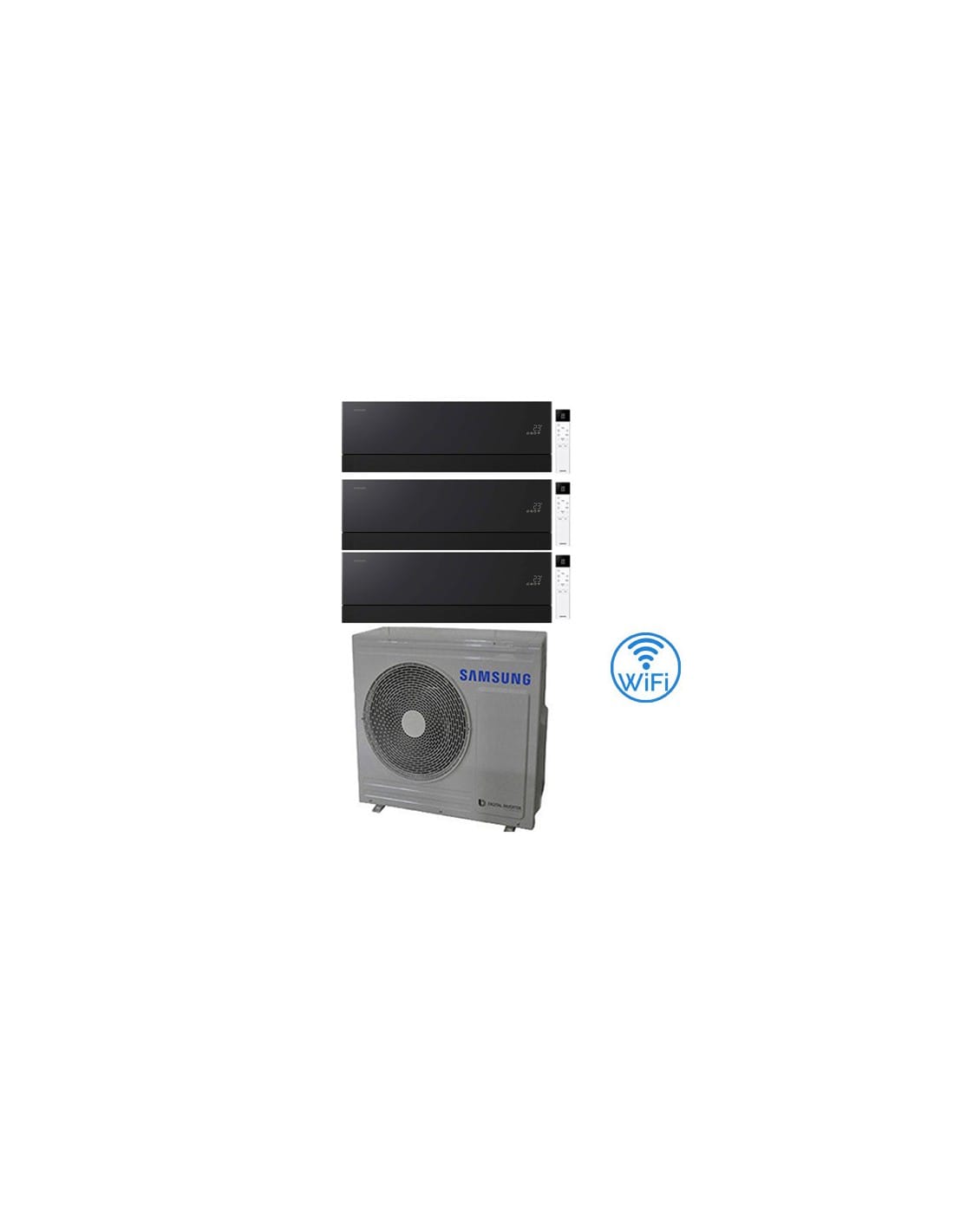 Climatizzatore Condizionatore Samsung Windfree Première Plus Soapstone Charcoal Wifi Trial Split R32 Inverter 9 + 12 + 12 BTU composto da una unità esterna AJ068TXJ3KG/EU, una unità interna da 9000 BTU AR70H09CAABNEU e due unità interne da 12000 BTU AR70H12CAABNEU Classe A++/A+ Gas R32. Spedizione su pedana Iva e trasporto inclusi.