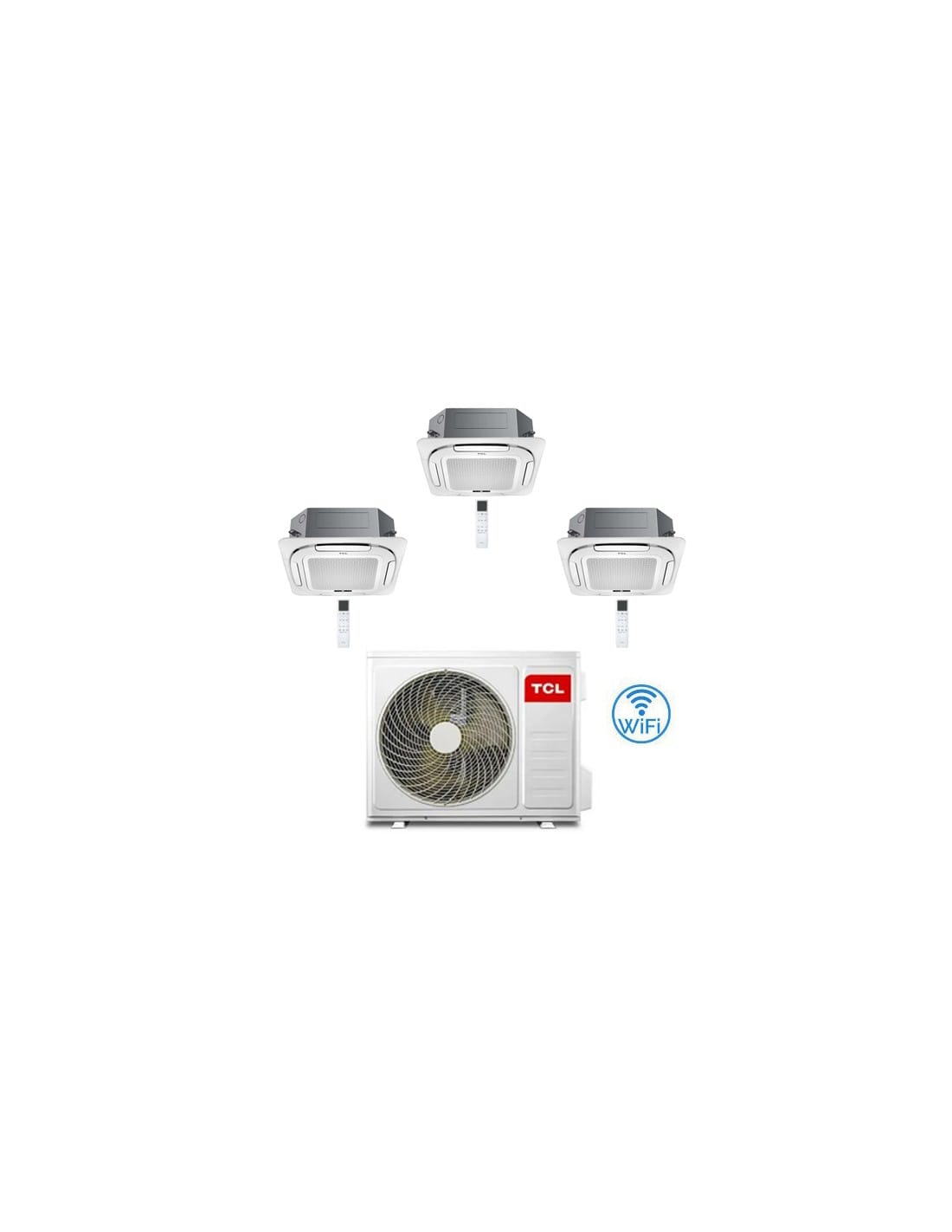 Climatizzatore Condizionatore TCL Cassetta 4 Vie Compact Wi-Fi R32 Trial Split Inverter 9 + 9 + 18 BTU composto da una unità esterna MT2730, due unità interne da 9000 BTU MN09SS2 e una unità interna da 18000 BTU MN18SS3 con telecomando e griglia Classe A++/A+ Gas R32. Spedizione su pedana iva e trasporto inclusi. Cassetta 4 Vie Compact TCL