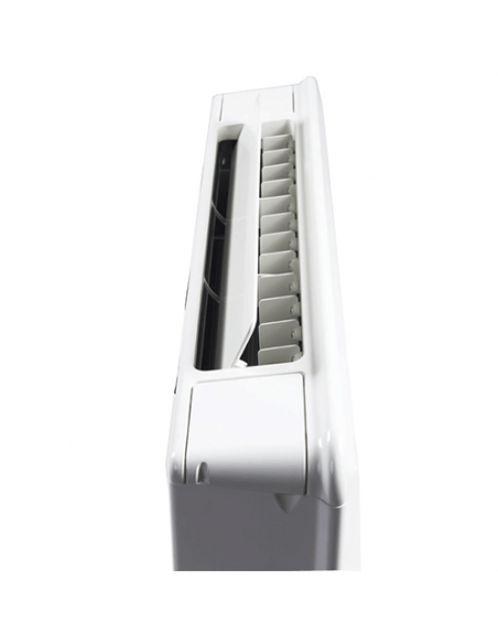Il mobile di copertura di design colore RAL9010 è di dimensioni contenute, costituito da lamiera di acciaio e ABS stabilizzato agli UV. La griglia superiore è costituita da un flap ed alette orientabili, costituito da microinterruttore che interrompe il funzionamento dell’unità quando viene posto in posizione di chiusura.